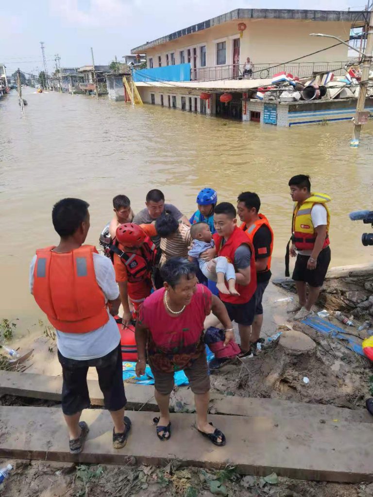 寺庄顶村位于新乡市牧野区,紧邻共产主义渠,人口多达数千人。beats365抢险突击队到达现场时,洪水已经齐腰深。村里断水断电,通讯失联,被困群众中甚至有许多老人、孩子、残疾人等,水位仍在不断上涨,境况十分危险。